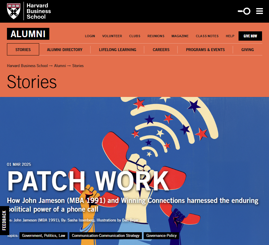 The week before the November 2024 US elections was like so many that came before at Winning Connections, with John Jameson (MBA 1991) padding around his firm’s Capitol Hill town house in athletic shorts, trying to demonstrate that the telephone still has a role to play in politics.